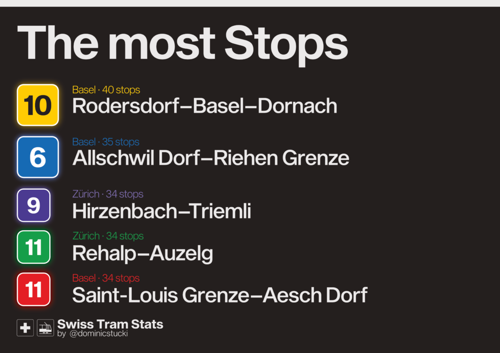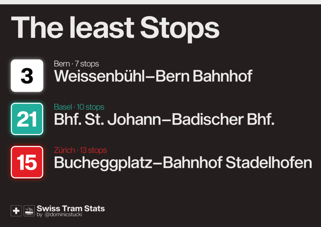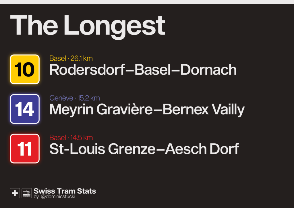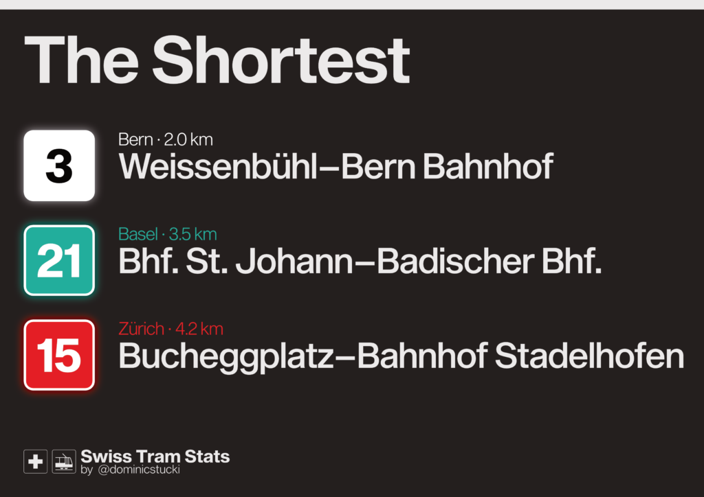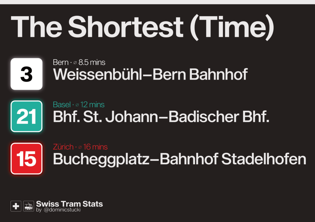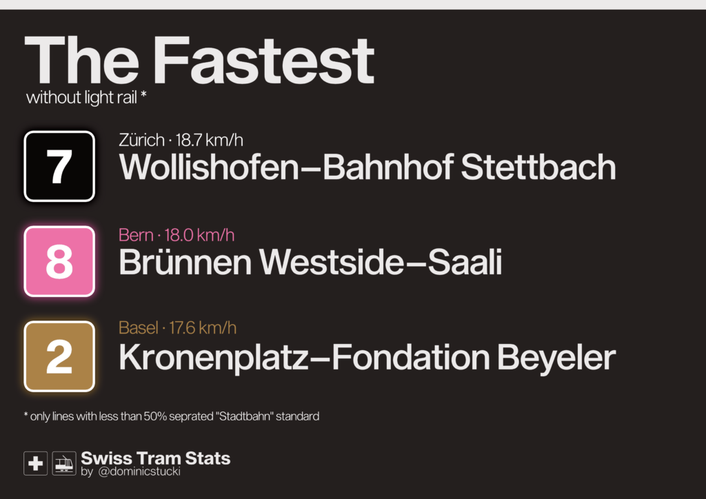 If you want to look at classic tram lines only, it looks like this: 7 (ZH) and 2 (BS) have some separated „high speed“ sections and a rather direct route through the city centres, but Bern’s 8 is a surprise to me.