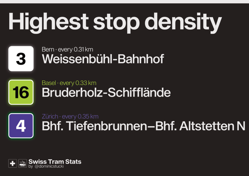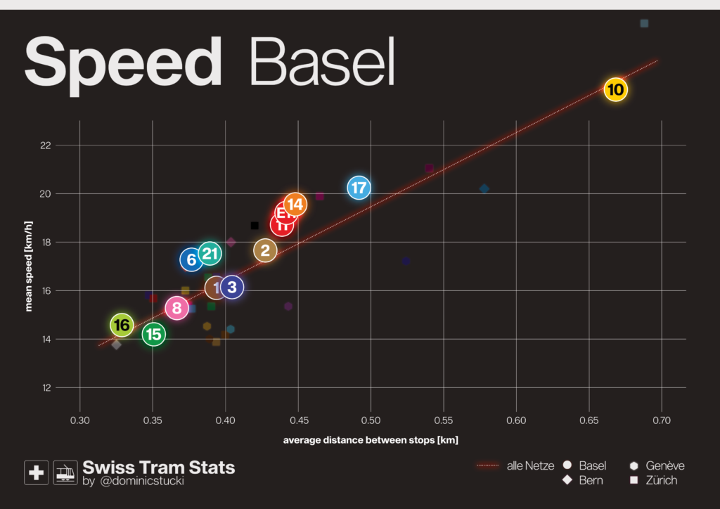 🟦 Zürich in general has a pretty high stop density. Most lines are between 15 and 17 km/h and one stop every 0.35-0.40km. 10, 12 and 20 run on separated LRT infrastructure for parts or even all the line.