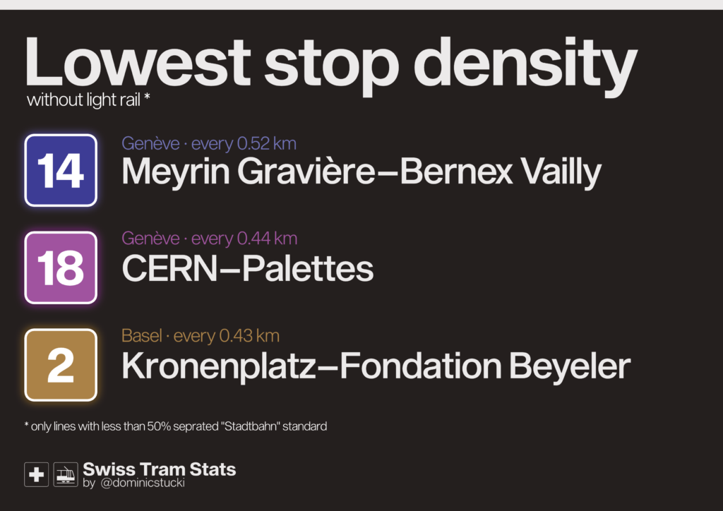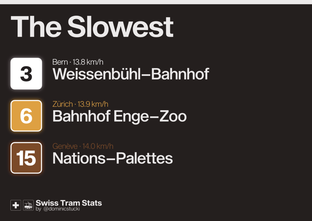 On the other end, we find our old friend No. 3 in Bern, and two other relatively short lines: Zürich’s mountainous and winding line 6 and the 15 in Genève. The latter is interesting: Despite a stop density of 0.37km, it’s very slow.