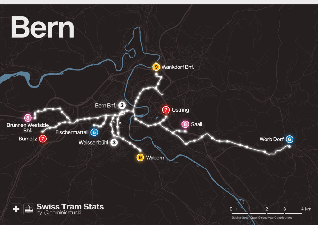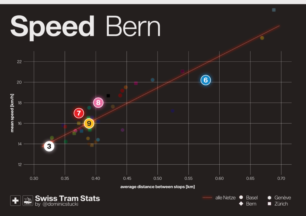 🟥 Bern’s trams are – astonishingly, as Bern is considered to be a „slow“ city – relatively fast. Except for the short line 3, slowest of all, and the 6 with moderate speeds for an integrated former railway (possibly due to single track and large city centre part).
