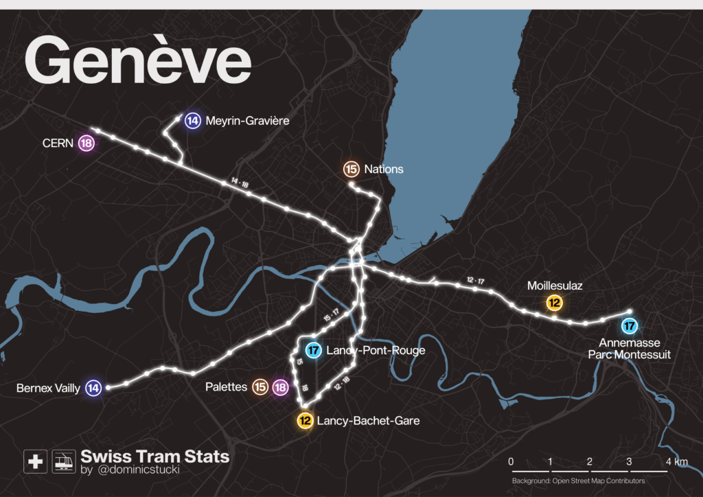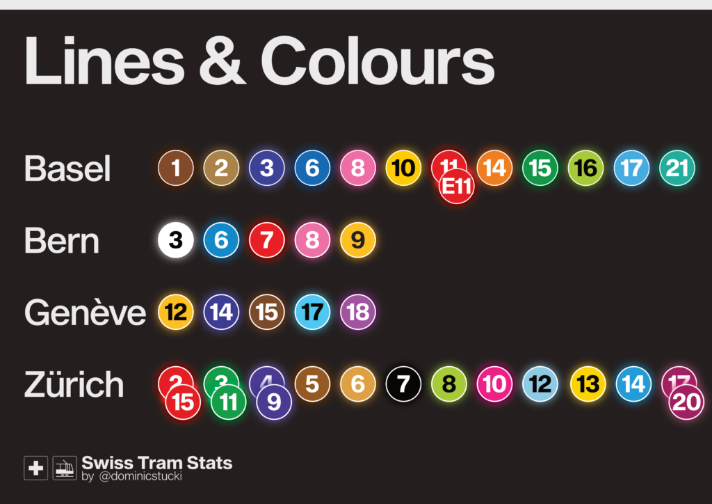 For the fans of colours and numbers, here’s an overview of all lines and numbers. All four cities use a colour code, but only Zürich and Genève are consistently using the colours on vehicles and all media. 1 is the lowest, 21 the highest route number.