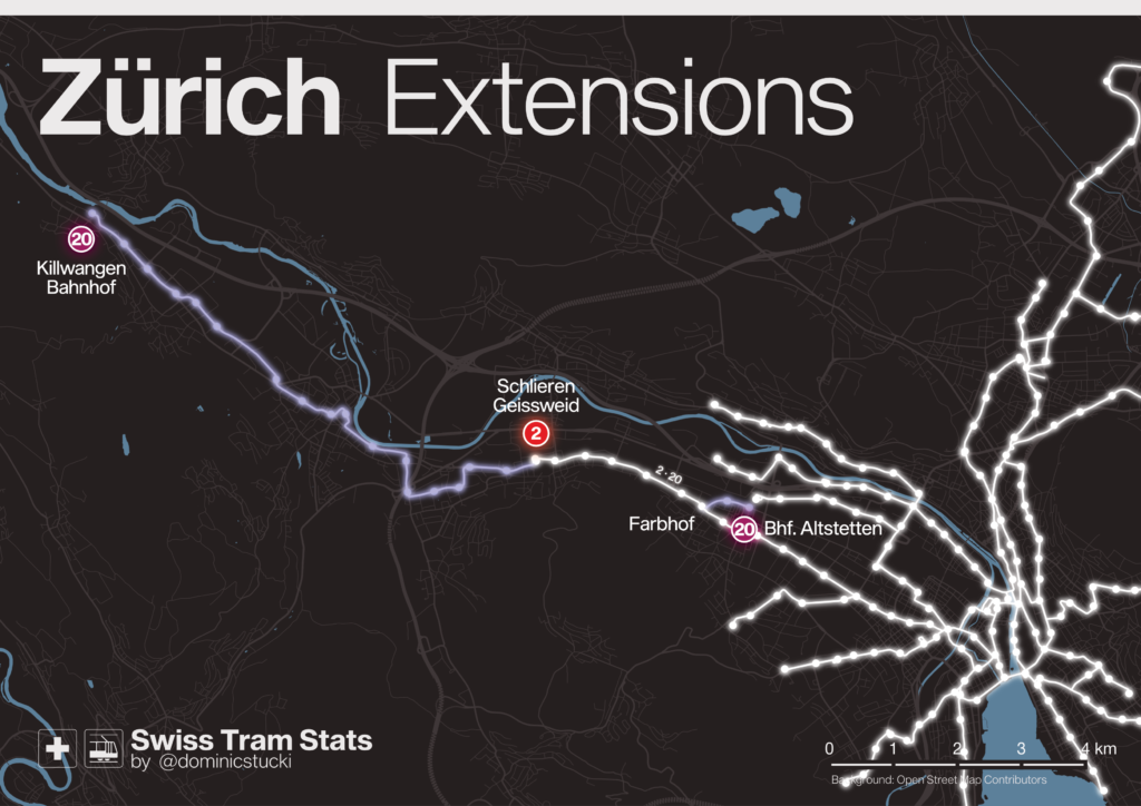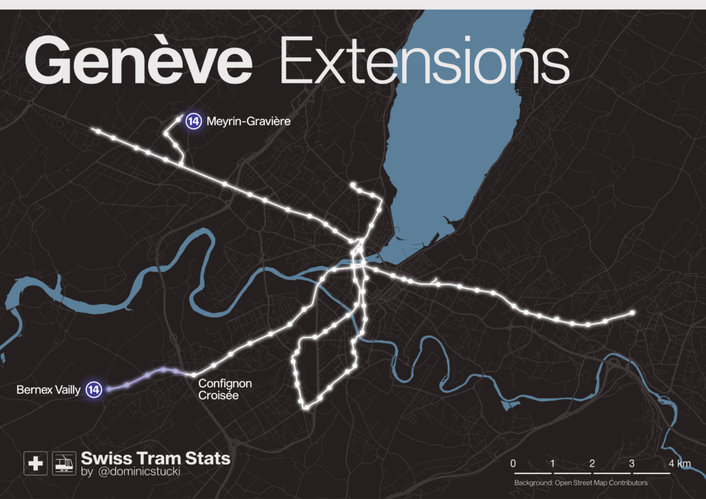 Within the two years since the last update, two new routes have been opened. The line 14 extension to Bernex near Genève and the second phase of the 13.1 km long «Limmattalbahn» LRT line in the Zürich network.