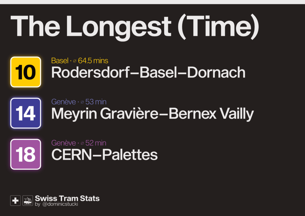 Does the shortest line also have the shortest journey time? Yes, at least for the shortest three and the longest two on the list. Genève’s line 18 needs 52 minutes for 13km „only“.