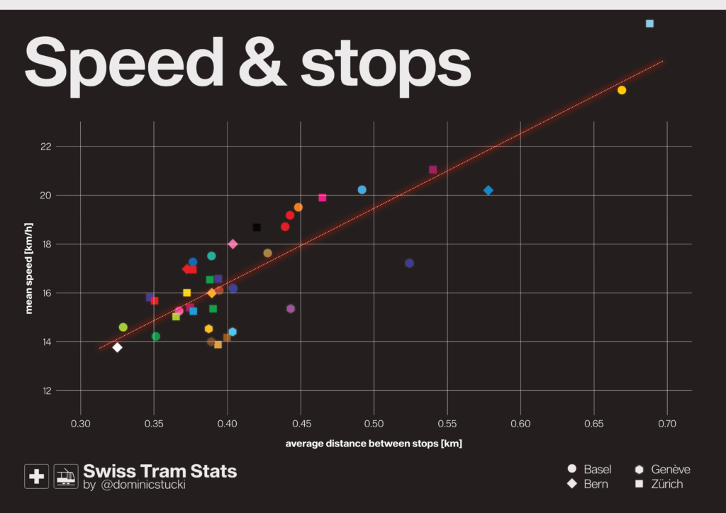 This plot shows the commercial speed and mean stop density of all tram lines in Switzerland. Tram lines above the regression line have speeds above average in relation to their stop density.