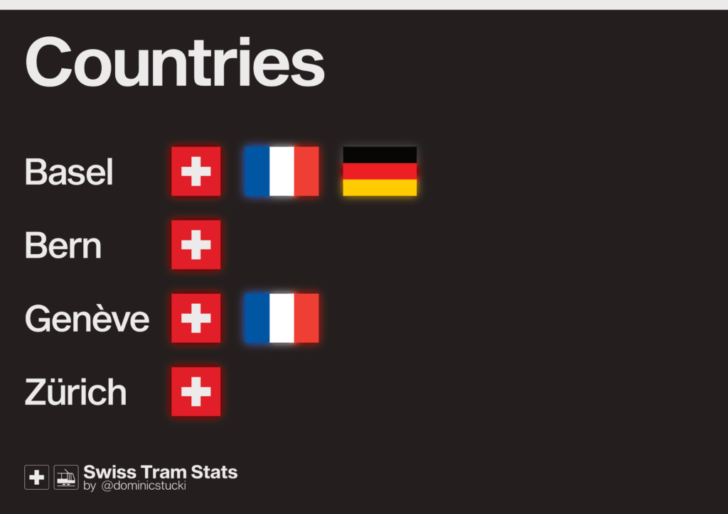 The number of cities with a tram network remains unchanged: 4. Genève, Zürich, Bern and Basel. Note: I’m not counting Neuchâtel since the Neuchâtel-Boudry line is a standard narrow gauge line with a standard signalling system, even if it was once part of the citiy’s now dismanteled tram network. The same goes for Waldenburgerbahn, Ferrovie Lugano – Ponte-Tresa and Appenzellerbahnen’s Appenzell – Trogen line. These all are standard narrow gauge railway lines, even if they are operated with tram-like wehicles.