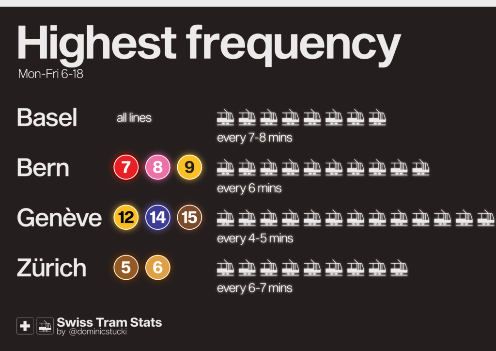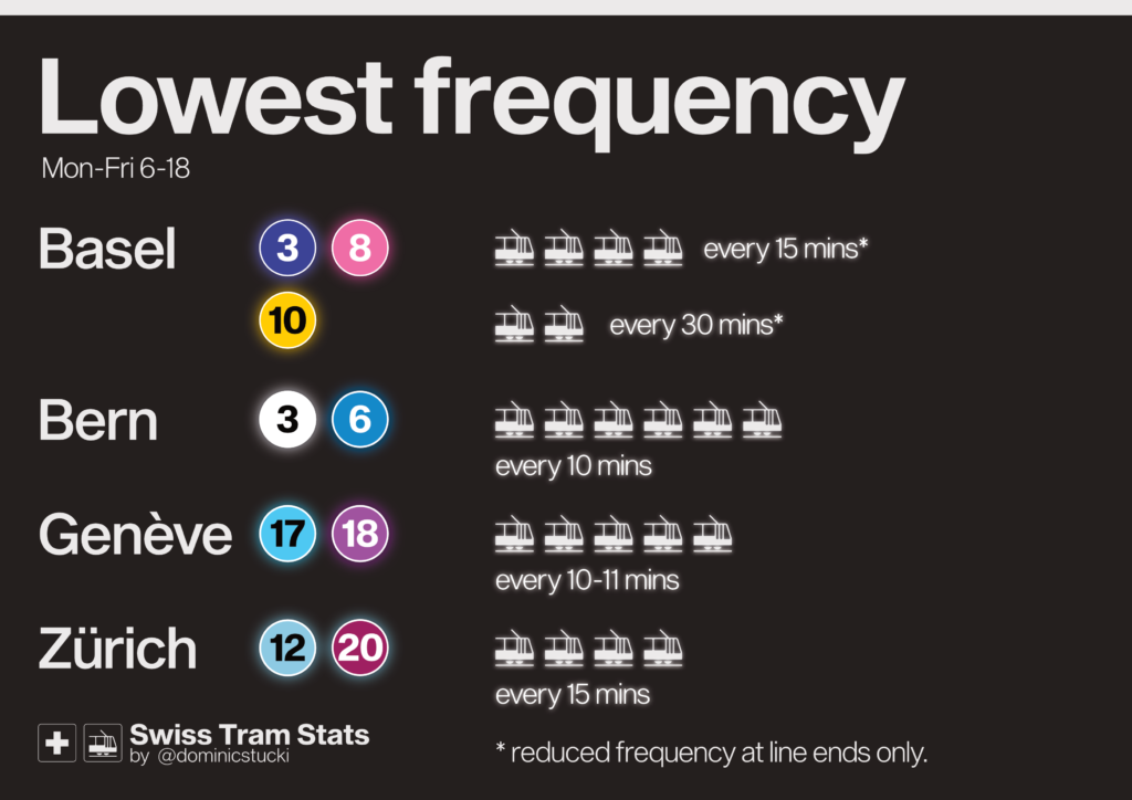 On the other hand, Bern and Genève operate tram lines in the city centre with less than 8tph. These complement more frequent lines (Genève) or serve short routes (Bern). In Basel + Zurich, only routes outside the city in less populated areas have less than 8tph.